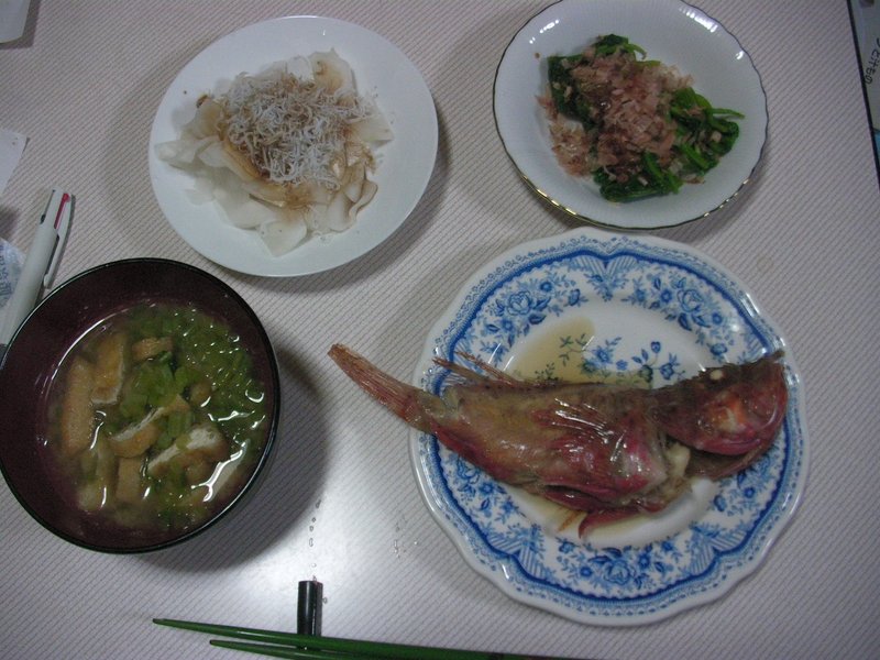 めざし キムチ ほうれん草おひたし かぼちゃとエノキの味噌汁 |
