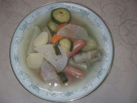 ソーセージと野菜のスープ 大根、人参、キャベツ、トマト、じゃがいも、たまねぎ。 ソーセージ、卵、干し貝柱、塩、胡椒 パン 夕食 鯖の味噌煮 鯖、しょうが、葱 トマト 鯖の潮汁 |